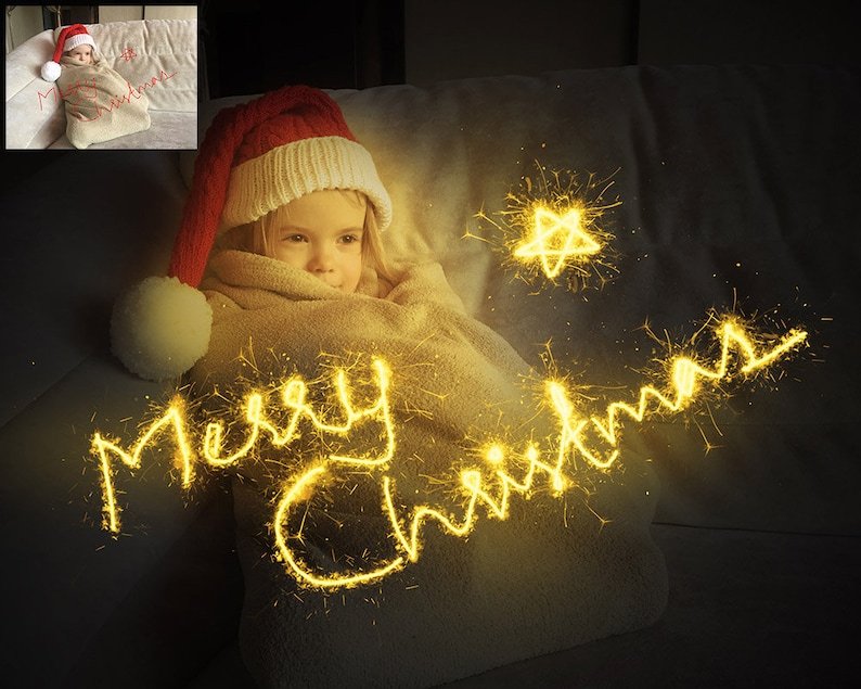 Christmas Sparklers Text Photoshop actions, Animated Sparkler Photoshop Action, custom text and shapes Magical Sparkling Photo Effect