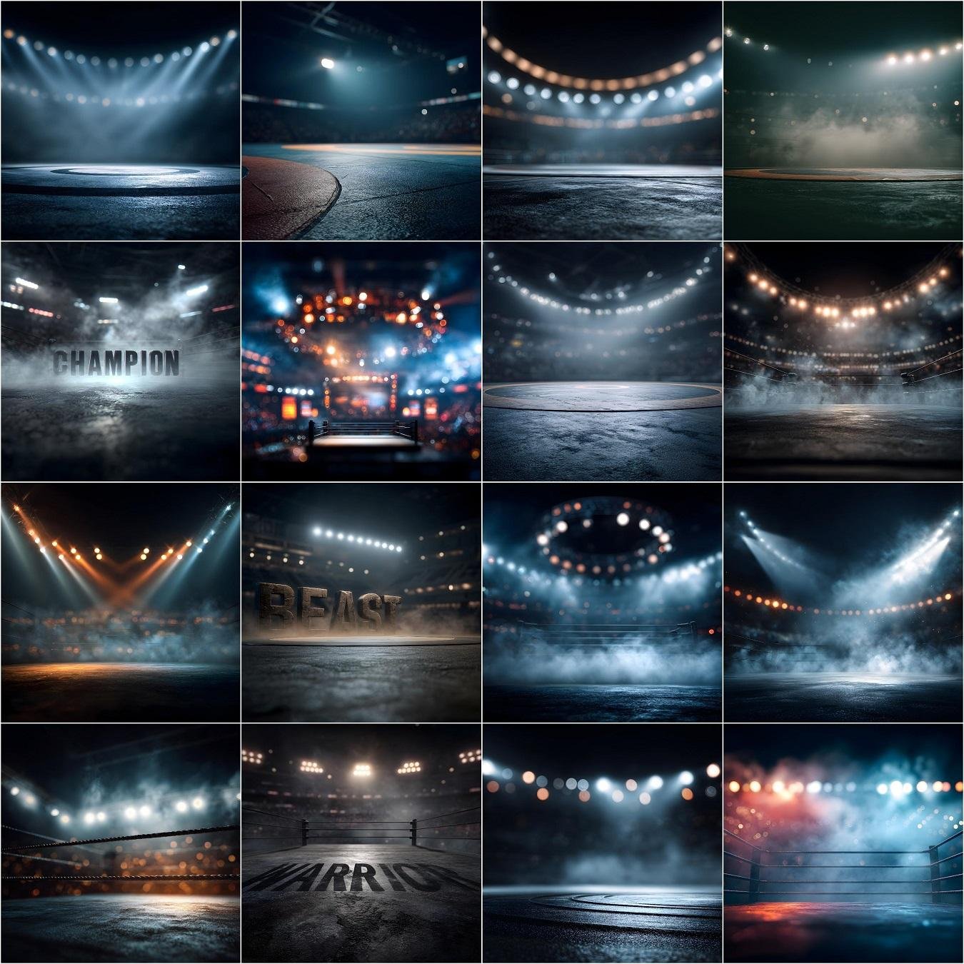 111 Wrestling Digital Backdrops – Epic Sports Photography Backgrounds, Wrestling Arena, Stadium Lights, Smoke & Bokeh, High-Resolution Photoshop JPGs for Photographers & Editors