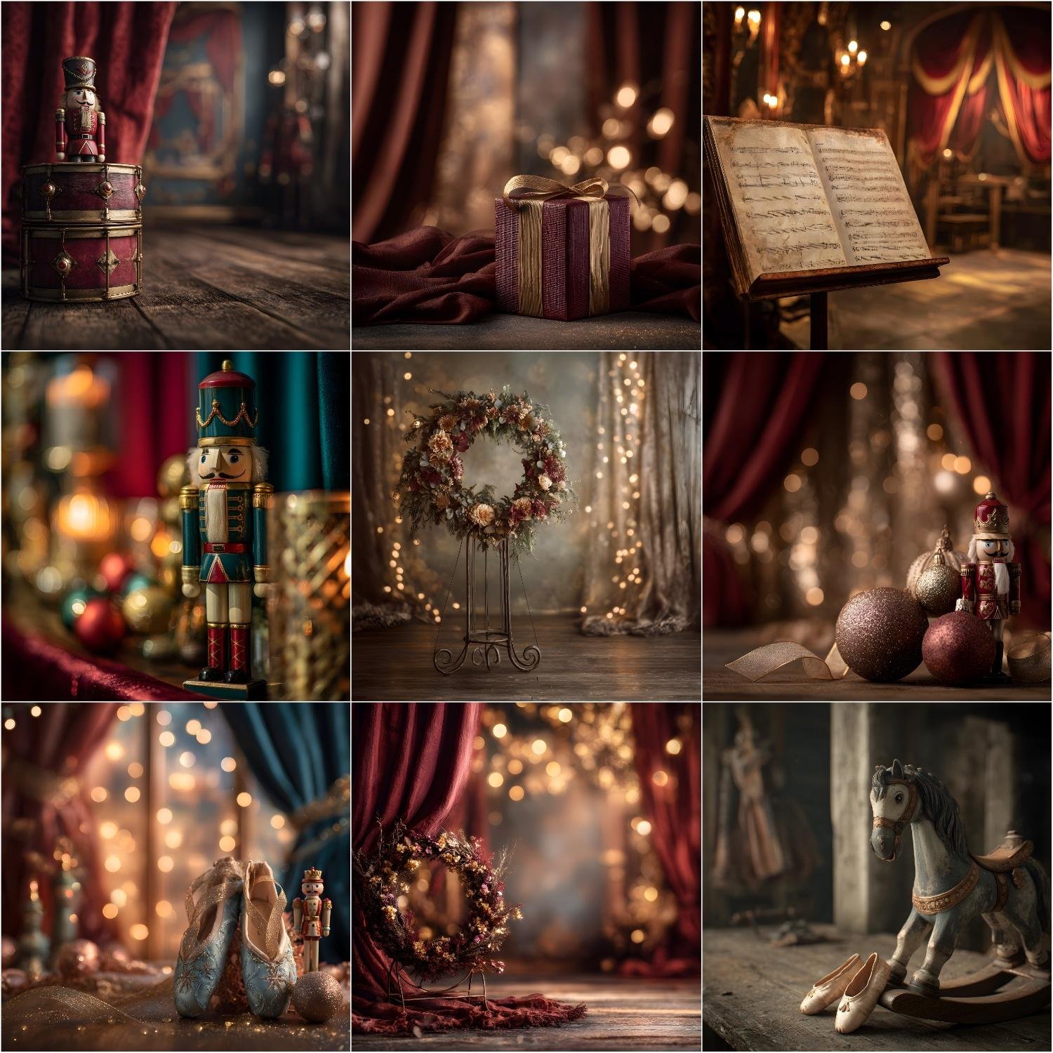 This 25-piece Fine Art Nutcrackercore Christmas digital backdrop bundle features luxurious theatrical holiday studio scenes inspired by vintage ballet, antique décor, and classic Christmas storytelling. Each backdrop is carefully designed with a deep red and muted gold color palette, vintage wooden floors, and moody fine-art color grading to create an elegant and timeless holiday atmosphere.