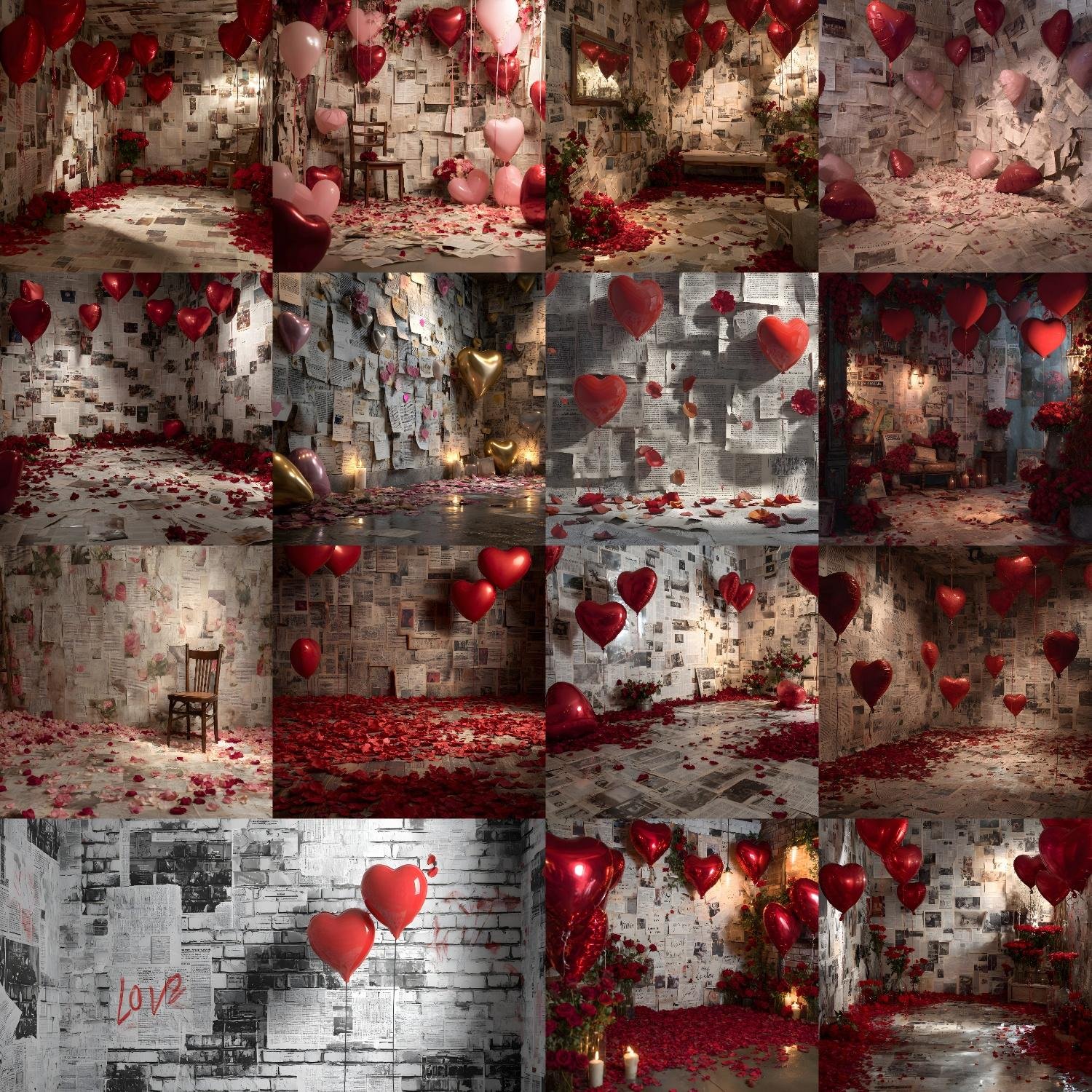 This 60 Valentine Digital Backdrops Bundle features romantic, fine-art photography backgrounds inspired by vintage newspaper wall textures, designed for modern studio composites. Each backdrop includes carefully styled hearts, balloons, flowers, rose petals, and love elements, creating a cozy yet editorial Valentine atmosphere.