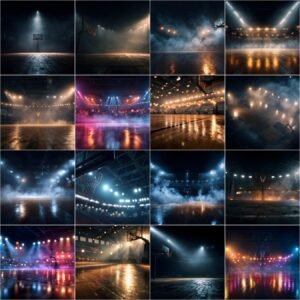 This professional collection includes 60 High-resolution basketball court digital backdrops, designed specifically for sports photographers, professional photographers, and photo editors who want dramatic stadium lighting, depth of field, smoke effects, and cinematic atmosphere — without renting a gym or complex lighting setups.